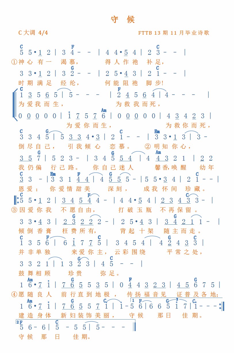 愿随良人前行直到地极,传扬福音见证普及各地;建造身体,新妇装饰美丽,守候那日佳期 。守候那日佳期 。