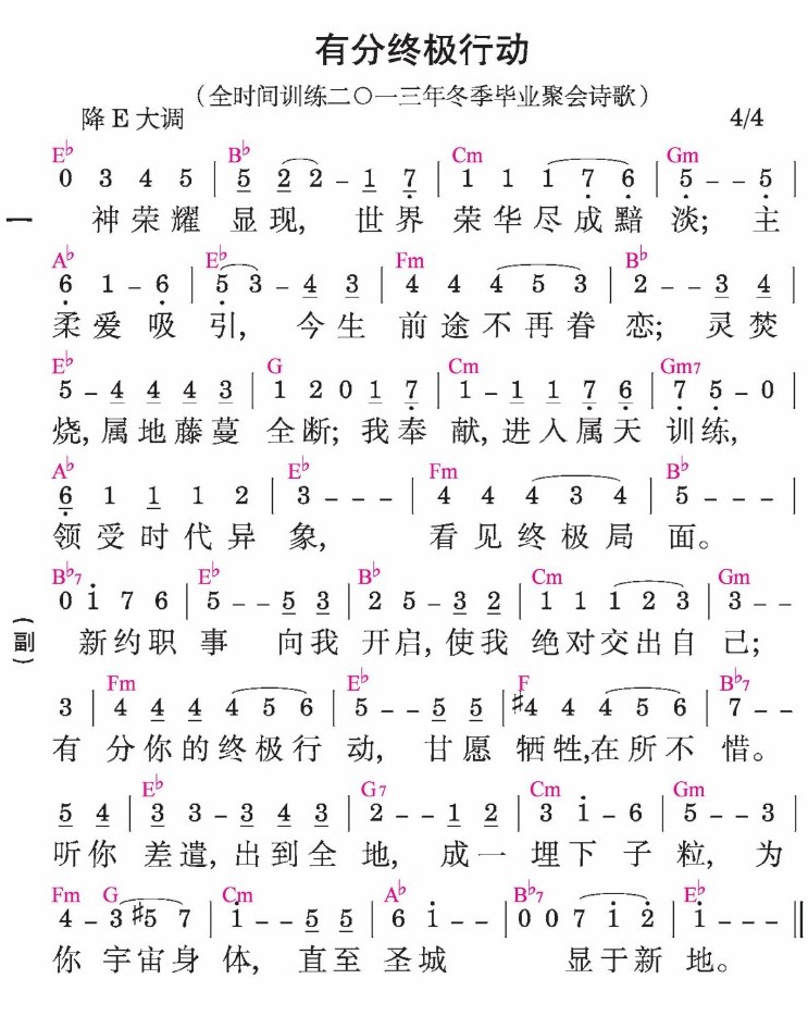 新约职事向我开启,使我绝对交出自己;有分你的终极行动,甘愿牺牲,在所不惜。听你差遣,出到全地,成一埋下子粒,为你宇宙身体,直至圣城显于新地。