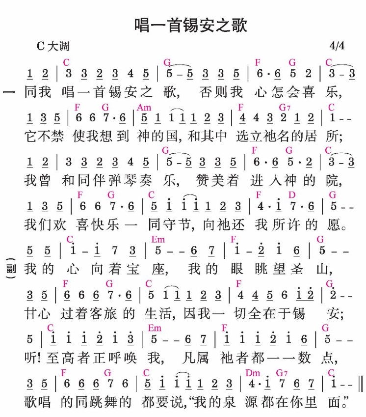 同我唱一首锡安之歌,否则我心怎会喜乐,它不禁使我想到神的国,和其中选立祂名的居所;我曾和同伴弹琴奏乐,赞美着进入神的院,我们欢喜快乐一同守节,向祂还我所许的愿。