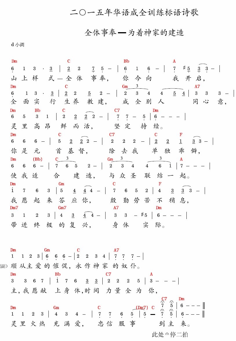 山上样式—全体事奉,你今向我开启,全面实行生养教建,成全别人同心意,灵里高昂鲜而活,坚定持续。你是元首基督,除去我单独乖僻,使我适合建造,与众圣联结一起。我愿起来答应你,殷勤劳苦不稍息,带进终极的复兴,身体实际。