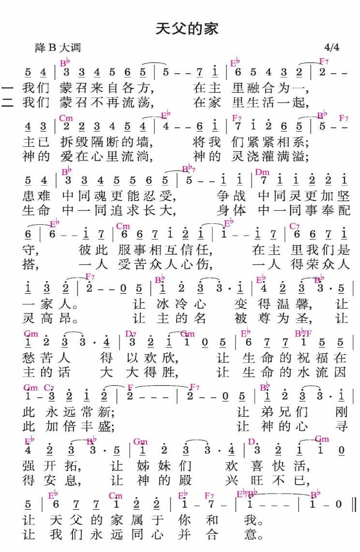 我们蒙召来自各方,在主里融合为一,主已拆毁隔断的墙,将我们紧紧相系;患难中同魂更能忍受,争战中同灵更加坚守,彼此服事相互信任,在主里我们是一家人。让冰冷心变得温馨,让愁苦人得以欢欣,让生命的祝福在此永远常新;让弟兄们刚强开拓,让姊妹们欢喜快活,让天父的家属于你和我。