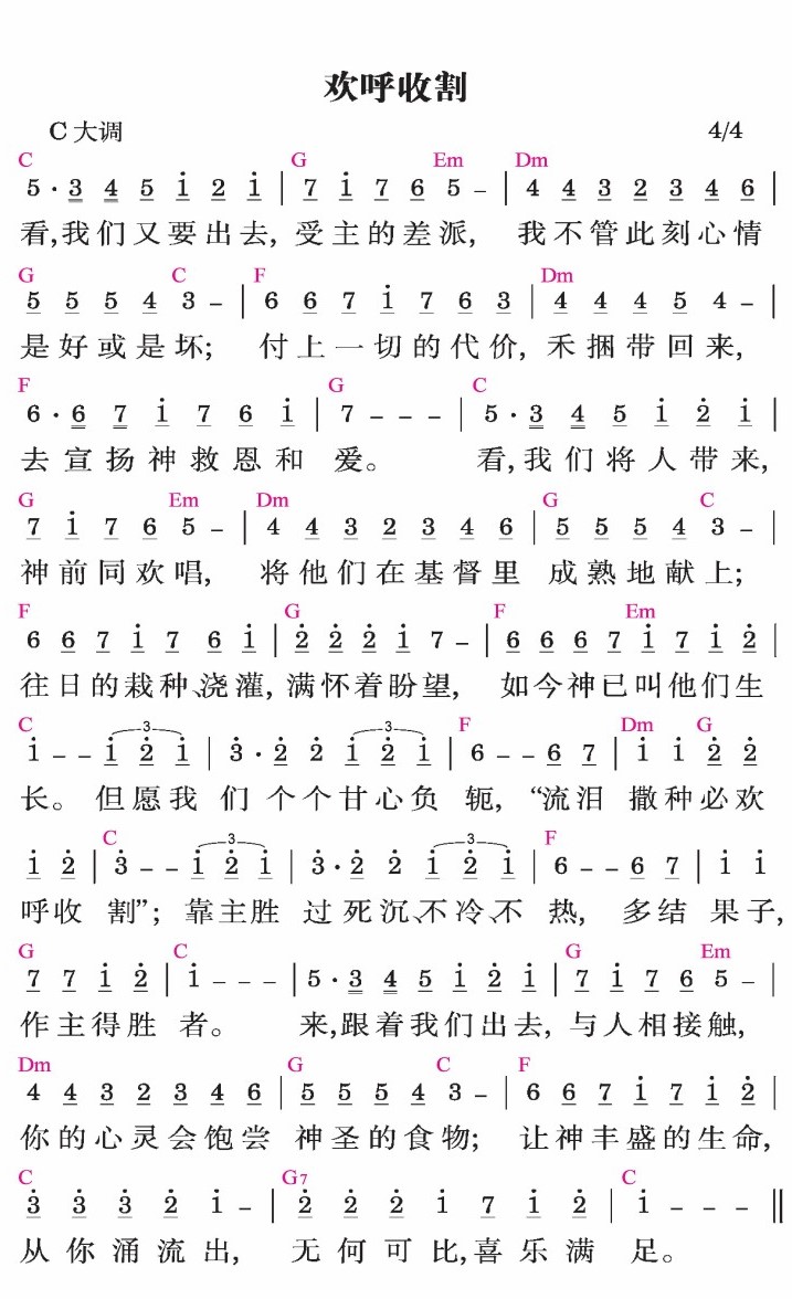 看,我们又要出去,受主的差派,我不管此刻心情是好或是坏;付上一切的代价,禾捆带回来,去宣扬神救恩和爱。看,我们将人带来,神前同欢唱,将他们在基督里成熟地献上;往日的栽种、浇灌,满怀着盼望,如今神已叫他们生长。但愿我们个个甘心负轭,“流泪撒种必欢呼收割”;靠主胜过死沉、不冷、不热,多结果子,作主得胜者。来,跟着我们出去,与人相接触,你的心灵会饱尝神圣的食物;让神丰盛的生命,从你涌流出,无何可比喜乐满足。