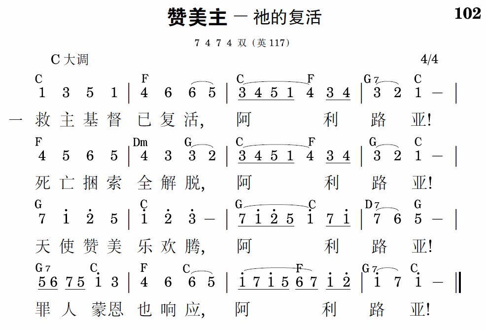 救主基督已复活,阿利路亚!死亡捆索全解脱,阿利路亚!天使赞美乐欢腾,阿利路亚!罪人蒙恩也响应,阿利路亚!