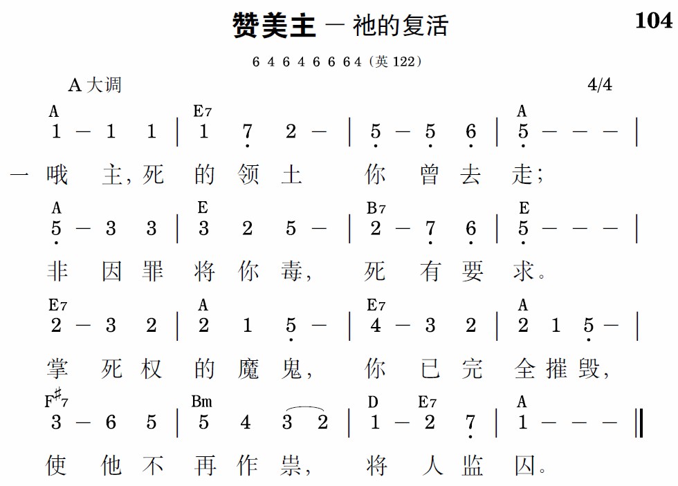哦主,死的领土你曾去走;非因罪将你毒,死有要求。掌死权的魔鬼,你已完全摧毁,使他不再作祟,将人监囚。