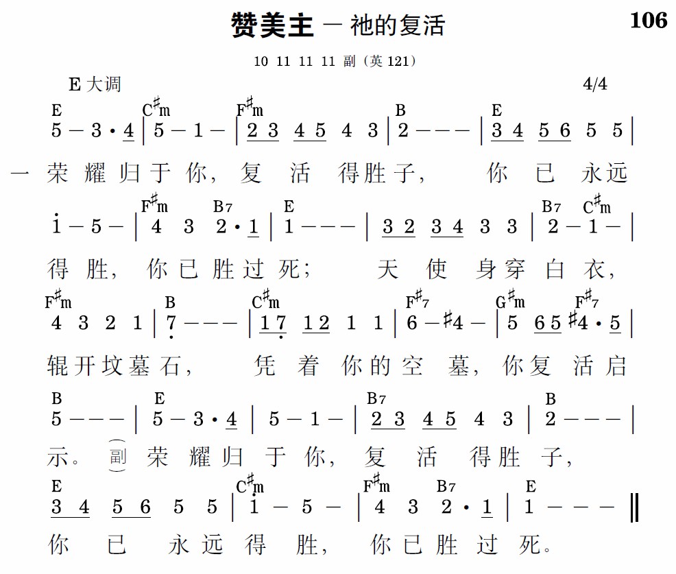 荣耀归于你,复活得胜子,你已永远得胜,你已胜过死;天使身穿白衣,辊开坟墓石,凭着你的空墓,你复活启示。