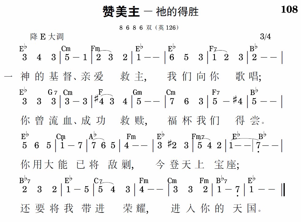 神的基督、亲爱救主,我们向你歌唱;你曾流血、成功救赎,福杯我们得尝。你用大能已将敌剿,今登天上宝座;还要将我带进荣耀,进入你的天国。