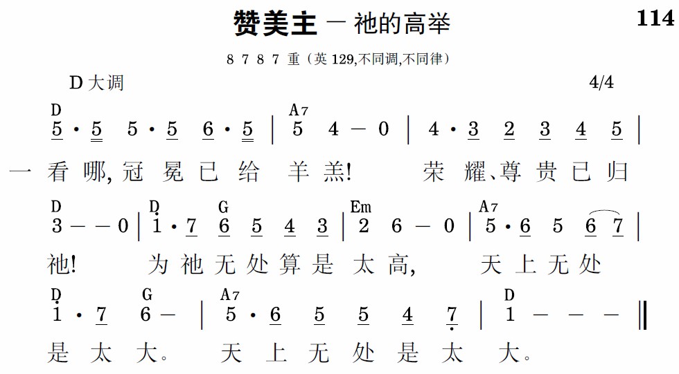 看哪,冠冕已给羊羔!荣耀、尊贵已归祂!为祂无处算是太高,天上无处是太大。天上无处是太大。