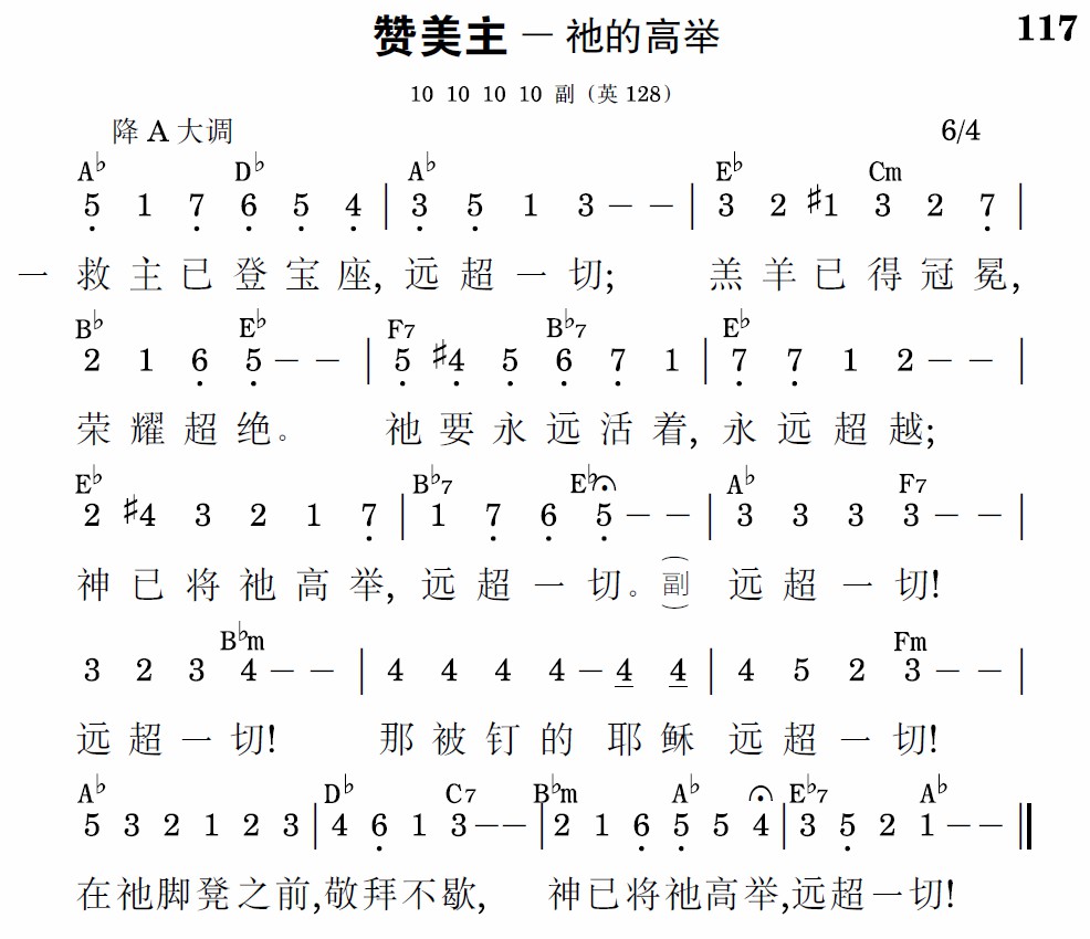 救主已登宝座,远超一切;羔羊已得冠冕,荣耀超绝。祂要永远活着,永远超越;神已将祂高举,远超一切。