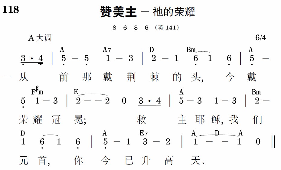 从前那戴荆棘的头,今戴荣耀冠冕;救主耶稣,我们元首,你今已升高天。
