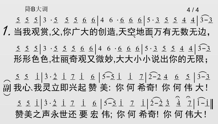 当我观赏,父,你广大的创造,天空、地面、万有无数无边,形形色色,壮丽、奇观又微妙,大大小小说出你的无限;