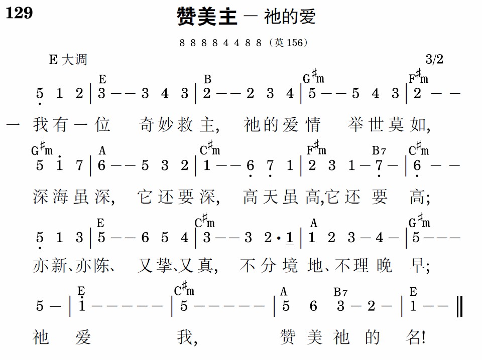 我有一位奇妙救主,祂的爱情举世莫如,深海虽深,它还要深,高天虽高,它还要高;亦新、亦陈、又挚、又真,不分境地、不理晚早;祂爱我,赞美祂的名!