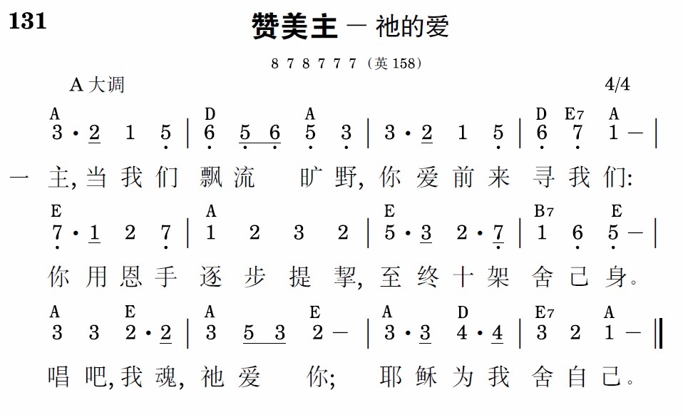 主,当我们飘流旷野,你爱前来寻我们:你用恩手逐步提挈,至终十架舍己身。唱罢,我魂,祂爱你;耶稣为我舍自己。