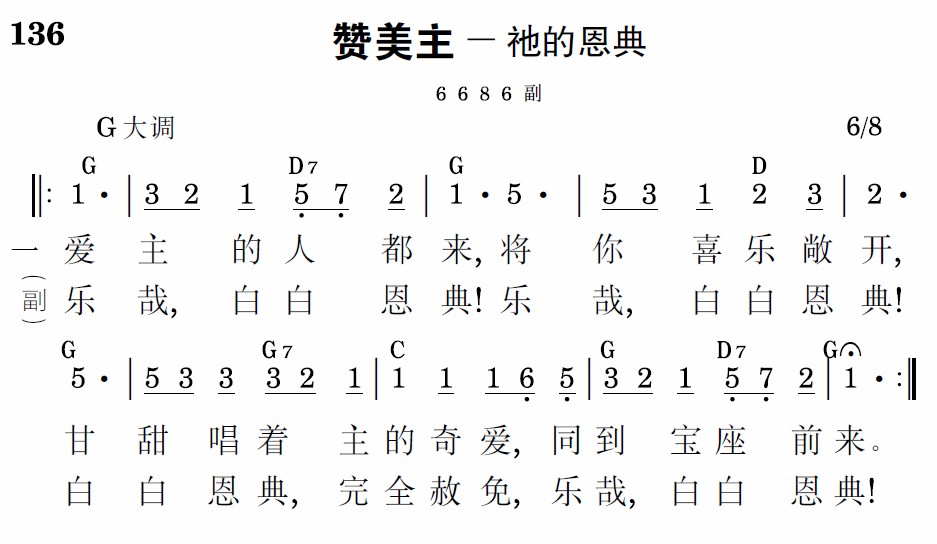 乐哉,白白恩典!乐哉,白白恩典!白白恩典,完全赦免,乐哉,白白恩典!