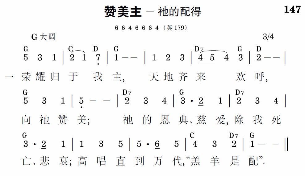 荣耀归于我主,天地齐来欢呼,向祂赞美;祂的恩典、慈爱,除我死亡、悲哀;高唱直到万代,“羔羊是配。”