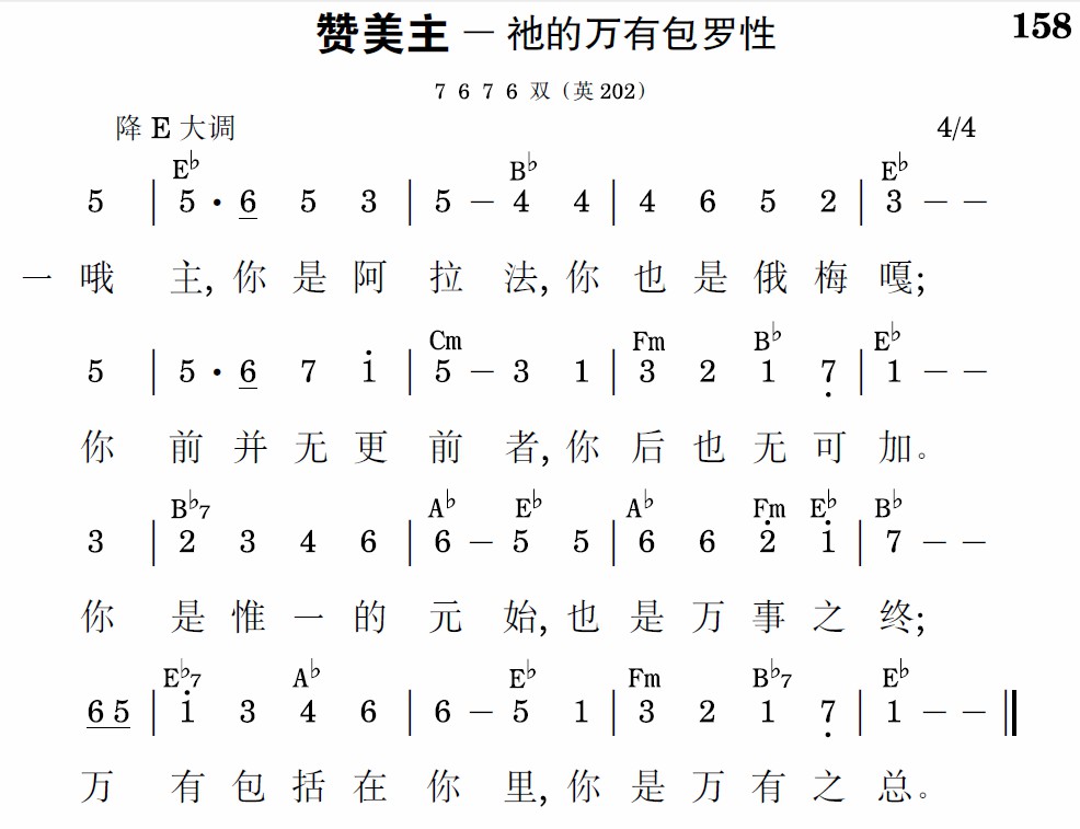 哦主,我们敬拜你,以爱将你珍赏;阿拉法及俄梅嘎,乃在万有之上。赞美你是元始者,你在一切之先;敬拜你是终结者,你后何可加添?