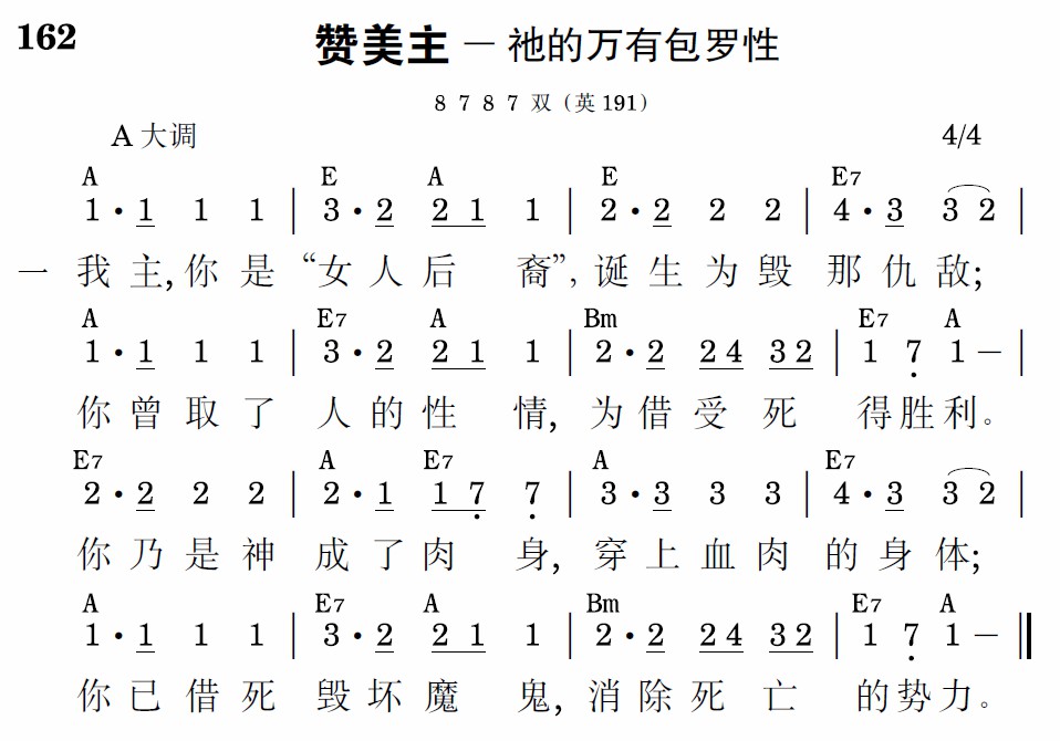 我主,你是“女人后裔,”诞生为毁那仇敌;你曾取了人的性情,为借受死得胜利。你乃是神成了肉身,穿上血肉的身体;你已借死毁坏魔鬼,消除死亡的势力。