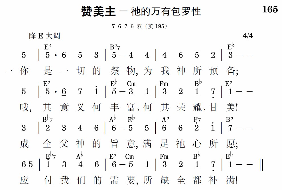 你是一切的祭物,为我神所预备;哦,其意义何丰富、何其荣耀、甘美!成全父神的旨意,满足祂心所愿;应付我们的需要,所缺全都补满!