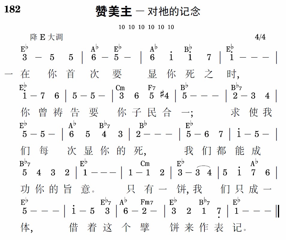在你首次要显你死之时,你曾祷告要你子民合一;求使我们每次显你的死,我们都能成功你的旨意。只有一饼,我们只成一体,借着这个擘饼来作表记。