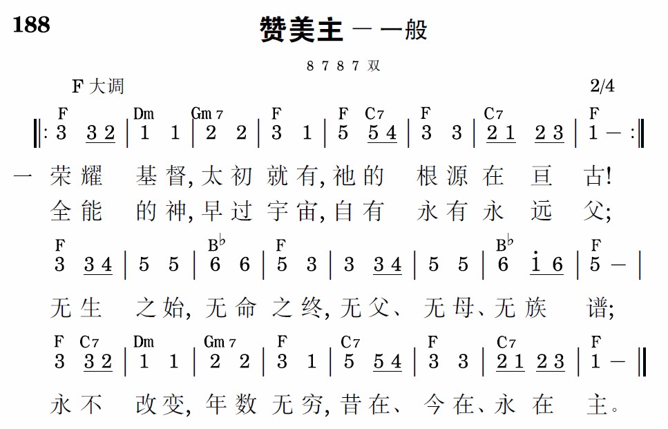 荣耀基督,太初就有,祂的根源在亘古!全能的神,早过宇宙,自有永有永远父;无生之始,无命之终,无父、无母、无族谱;永不改变,年数无穷,昔在、今在、永在主。
