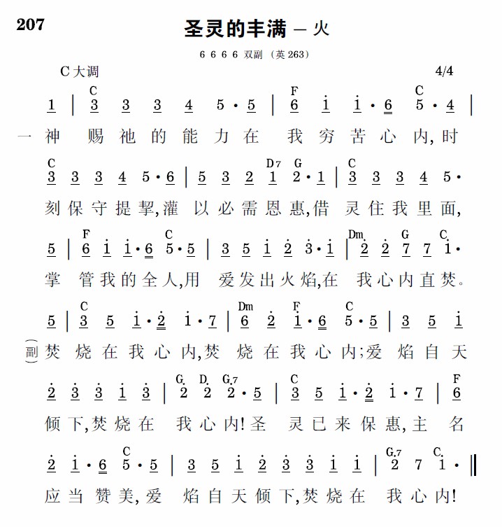 焚烧在我心内,焚烧在我心内;爱焰自天倾下,焚烧在我心内!圣灵已来保惠,主名应当赞美,爱焰自天倾下,焚烧在我心内!