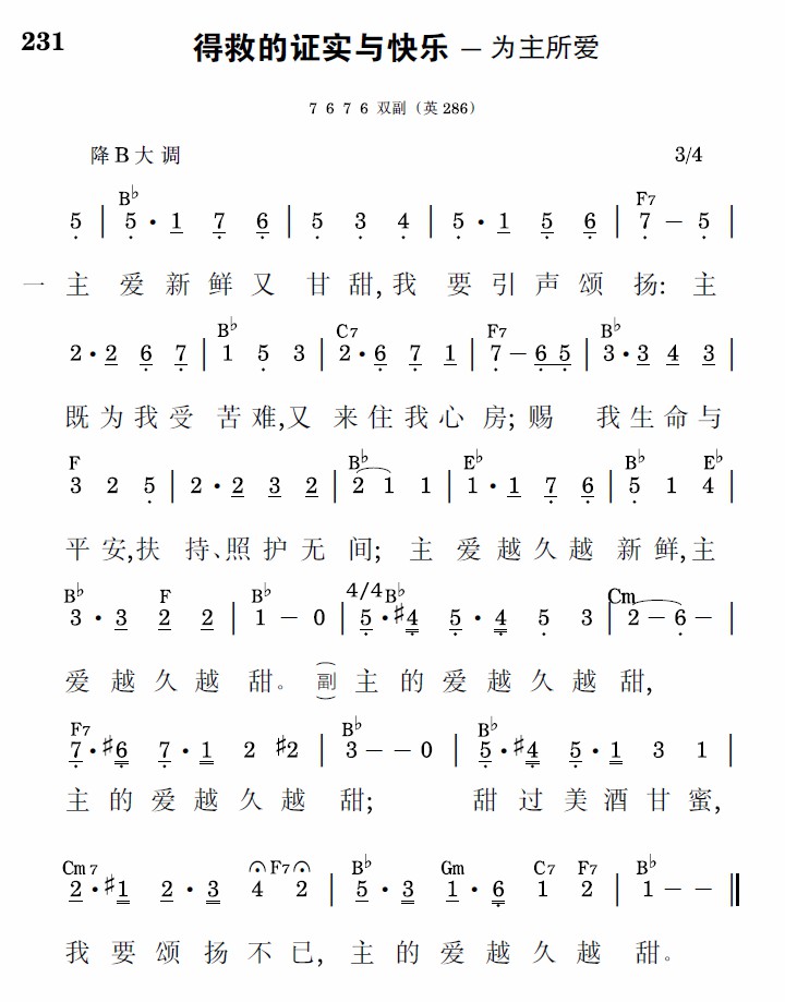 主爱新鲜又甘甜,我要引声颂扬:主既为我受苦难,又来住我心房;赐我生命与平安,扶持、照护无间;主爱越久越新鲜,主爱越久越甜。