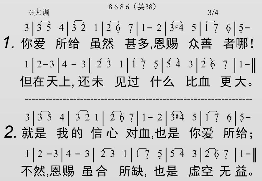 你爱所给虽然甚多,恩赐众善者哪!但在天上,还未见过什么比血更大。