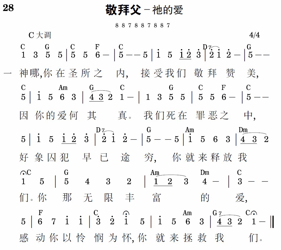 神哪,你在圣所之内,接受我们敬拜赞美,因你的爱何其真。我们死在罪恶之中,好像囚犯早已途穷,你就来释放我们。你那无限丰富的爱,感动你以怜悯为怀,你就来拯救我们。