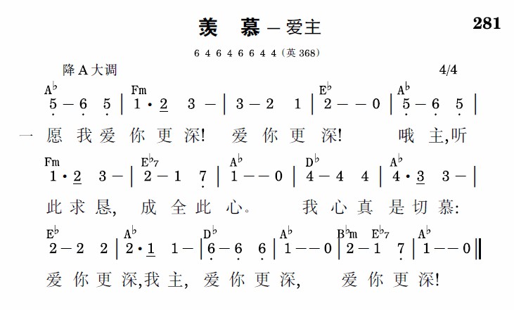 愿我爱你更深!爱你更深!哦主,听此求恳,成全此心。我心真是切慕:爱你更深,我主,爱你更深,爱你更深!