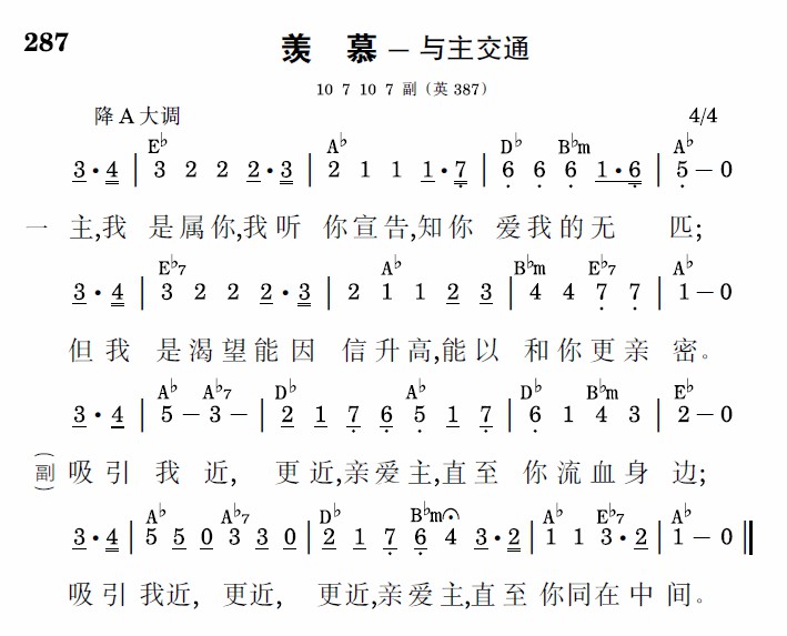 吸引我近,更近,亲爱主,直至你流血身边;吸引我近,更近,更近,亲爱主,直至你同在中间。