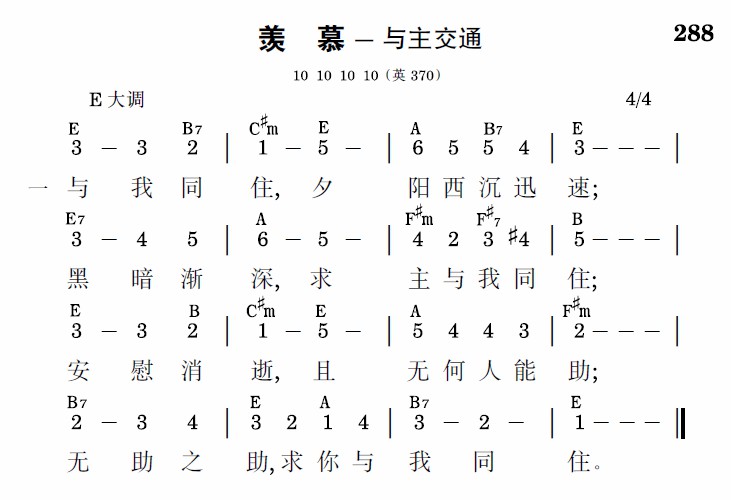 与我同住,夕阳西沉迅速;黑暗渐深,求主与我同住;安慰消逝,且无何人能助;无助之助,求你与我同住。