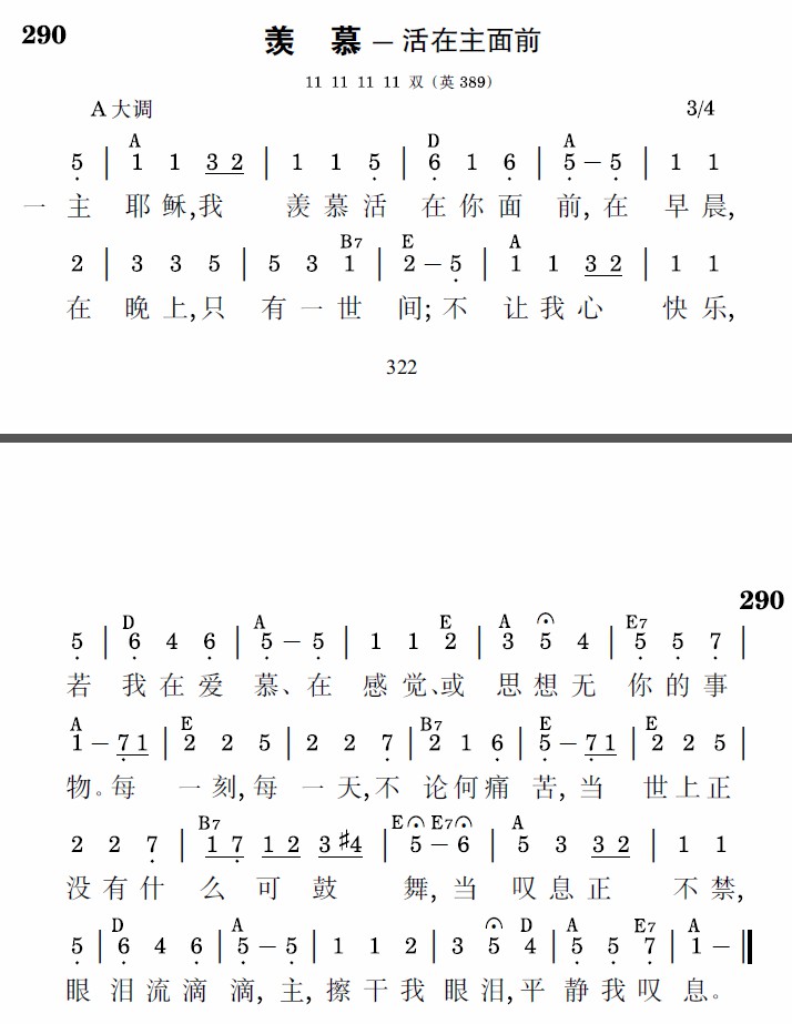 主耶稣,我羡慕活在你面前,在早晨,在晚上,只有一世间;不让我心快乐,若我在爱慕、在感觉、或思想无你的事物。每一刻,每一天,不论何痛苦,当世上正没有什么可鼓舞,当叹息正不禁,眼泪流滴滴,主,擦干我眼泪,平静我叹息。