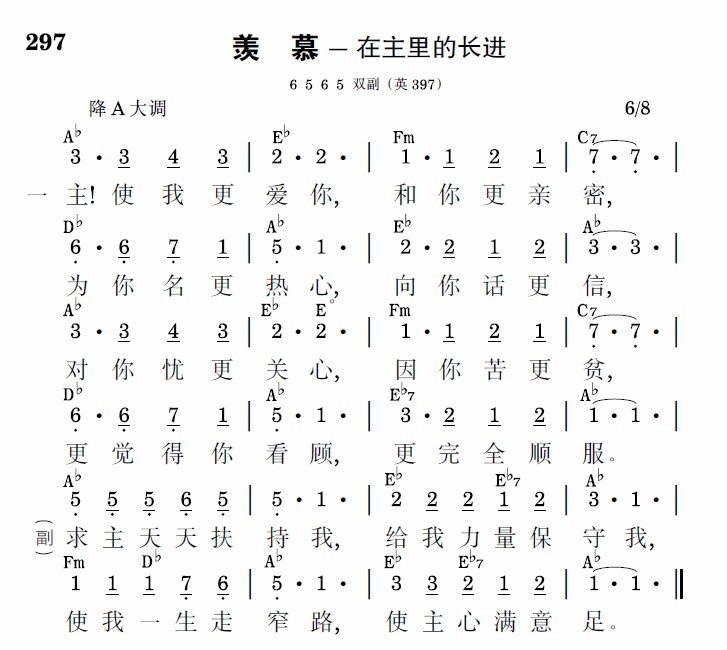 主!使我更爱你,和你更亲密,为你名更热心,向你话更信,对你忧更关心,因你苦更贫,更觉得你看顾,更完全顺服。