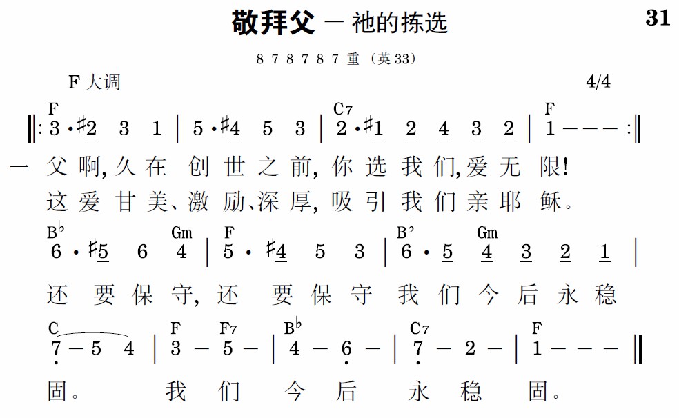 父啊,久在创世之前,你选我们,爱无限!这爱甘美、激励、深厚,吸引我们亲耶稣。还要保守,还要保守,我们今后永稳固。我们今后永稳固。