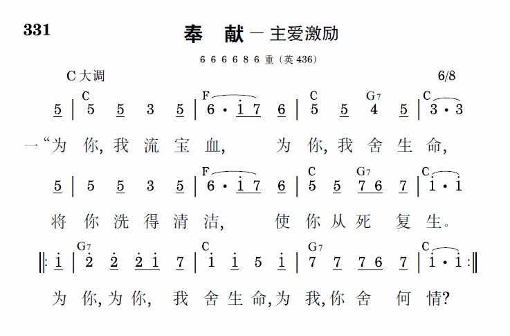 “为你,我流宝血,为你,我舍生命,将你洗得清洁,使你从死复生。为你,为你,舍生命,为我,你舍何情?