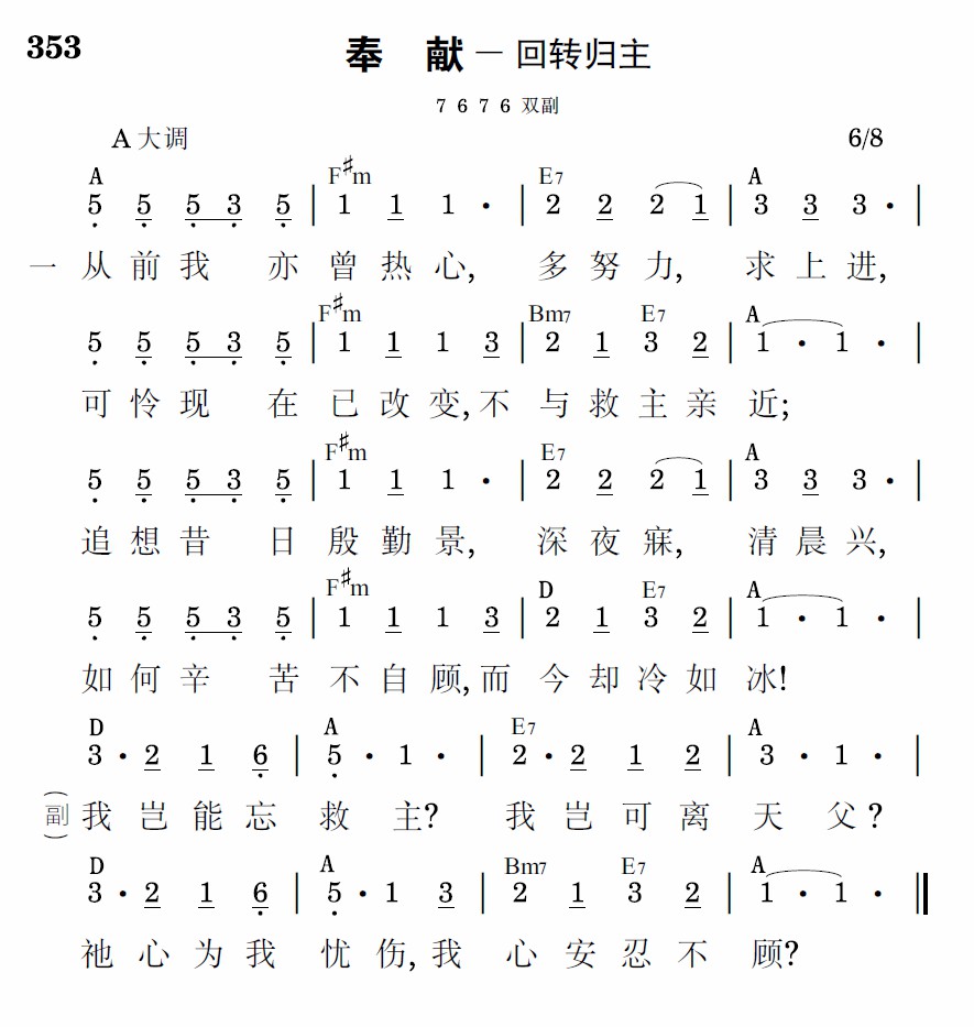 从前我亦曾热心,多努力,求上进,可怜现在已改变,不与救主亲近;追想昔日殷勤景,深夜寐,清晨兴,如何辛苦不自顾,而今却冷如冰!