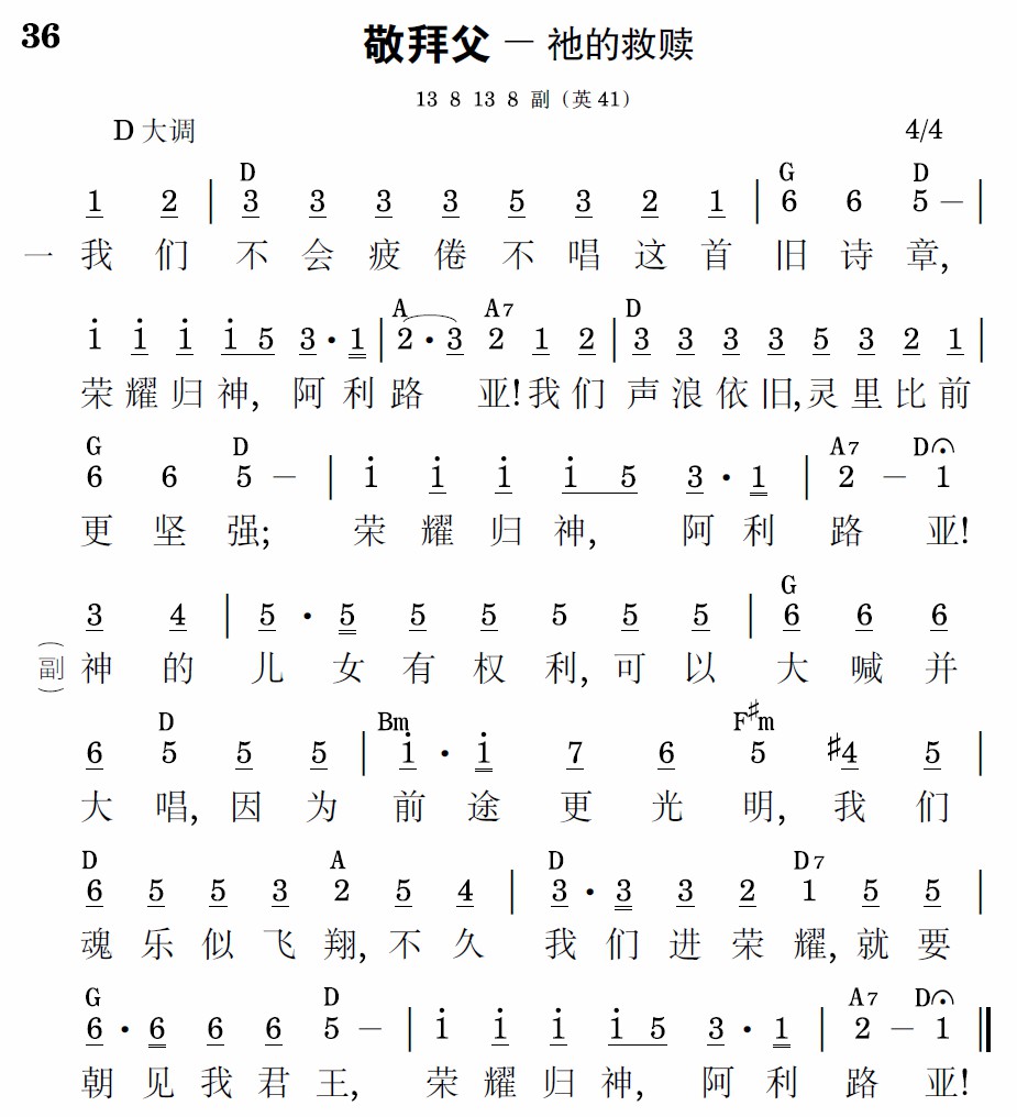 我们不会疲倦不唱这首旧诗章,荣耀归神,阿利路亚!我们声浪依旧,灵里比前更坚强;荣耀归神,阿利路亚!