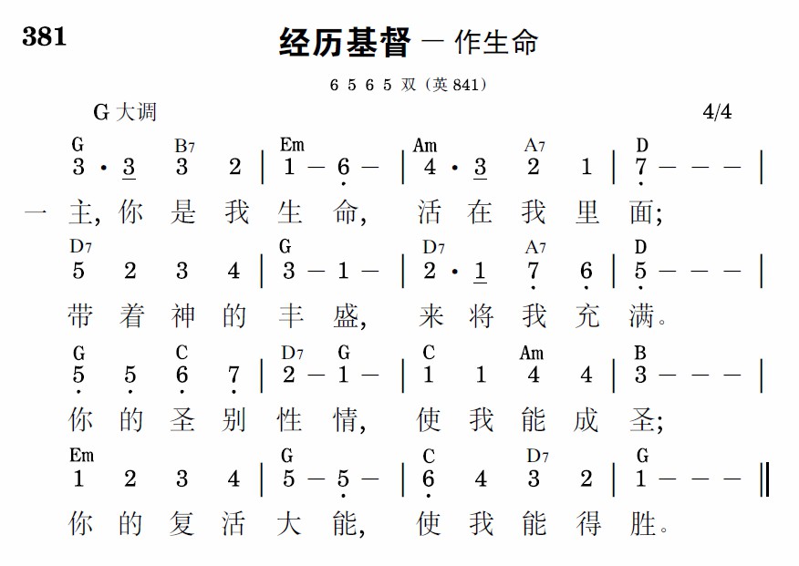 主,你是我生命,活在我里面;带着神的丰盛,来将我充满。你的圣别性情,使我能成圣;你的复活大能,使我能得胜。