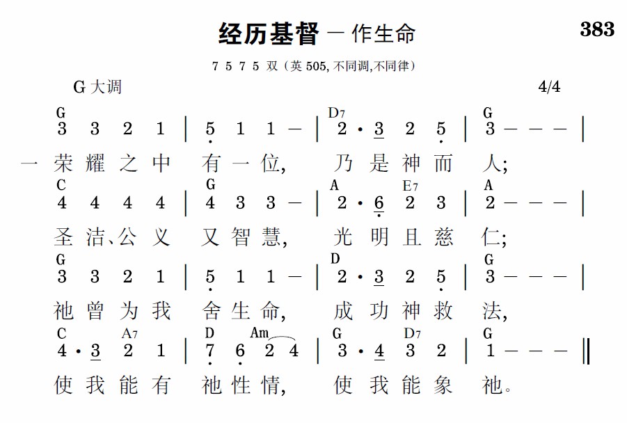 荣耀之中有一位,乃是神而人;圣洁、公义又智慧,光明且慈仁;祂曾为我舍生命,成功神救法,使我能有祂性情,使我能像祂。