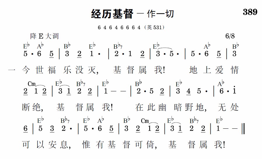 今世福乐没灭,基督属我!地上爱情断绝,基督属我!在此幽暗野地,无处可以安息,唯有基督可倚,基督属我!