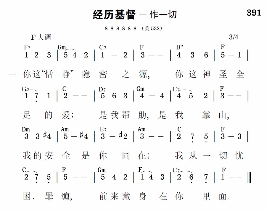 你这“恬静”隐密之源,你这神圣全足的爱;是我帮助,是我靠山,我的安全是你同在;我从一切忧困、罪缠,前来藏身在你里面。