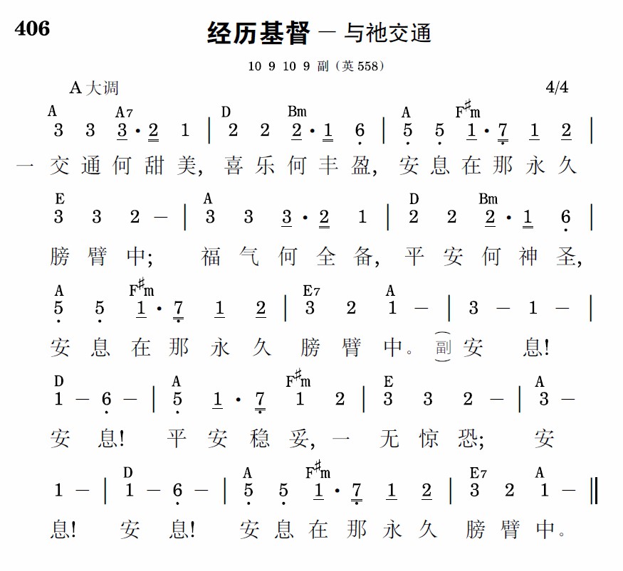 交通何甜美,喜乐何丰盈,安息在那永久膀臂中;福气何全备,平安何神圣,安息在那永久膀臂中。
