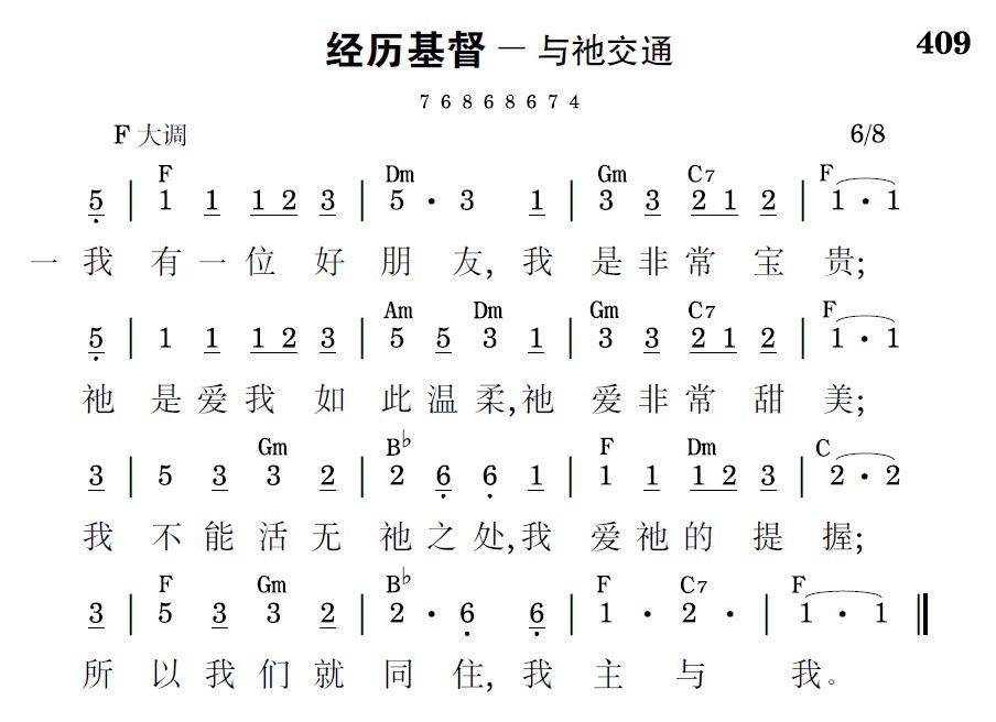 我有一位好朋友,我是非常宝贵;祂是爱我如此温柔,祂爱非常甜美;我不能活无祂之处,我爱祂的提握;所以我们就同住,我主与我。