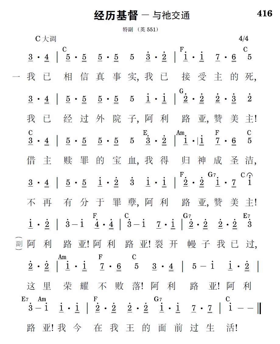我已相信真事实,我已接受主的死,我已经过外院子,阿利路亚,赞美主!借主赎罪的宝血,我得归神成圣洁,不再有分于罪孽,阿利路亚,赞美主!