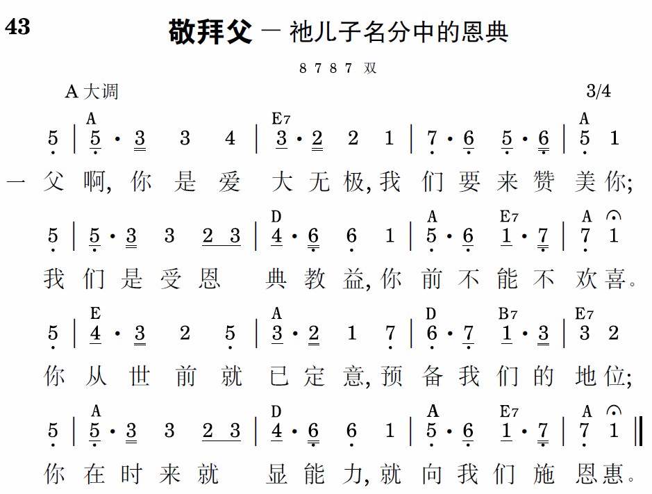 父啊,你是爱大无极,我们要来赞美你;我们是受恩典教益,你前不能不欢喜。你从世前就已定意,预备我们的地位;你在时来就显能力,就向我们施恩惠。