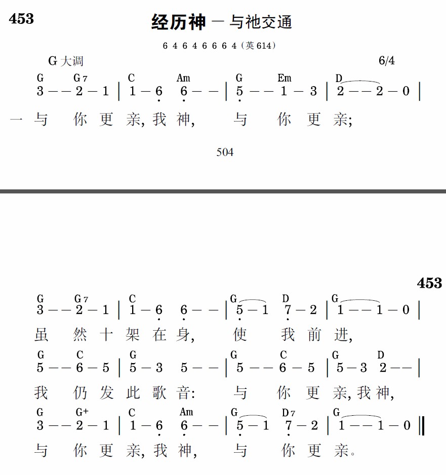 与你更亲,我神,与你更亲;虽然十架在身,使我前进,我仍发此歌音:与你更亲,我神,与你更亲,我神,与你更亲。