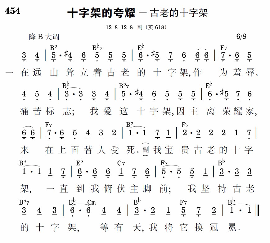 在远山耸立着古老的十字架,作为羞辱、痛苦标志;我爱这十字架,因主离荣耀家,来在上面替人受死。
