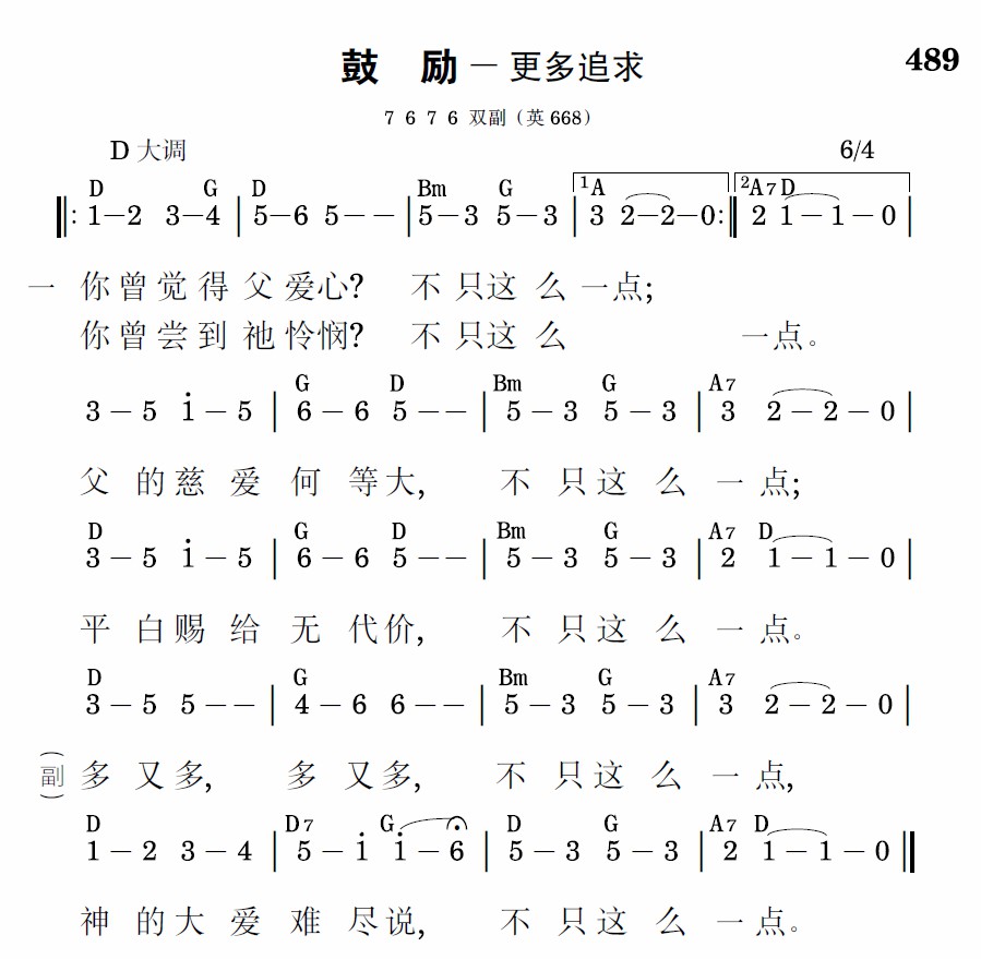 你曾觉得父爱心?不只这么一点;你曾尝到祂怜悯?不只这么一点。父的慈爱何等大,不只这么一点;平白赐给无代价,不只这么一点。