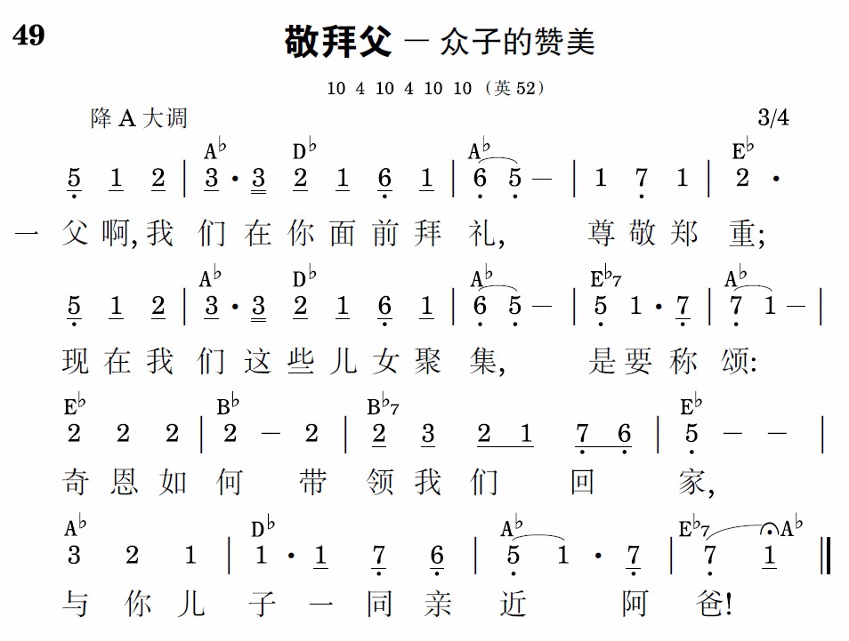 父啊,我们在你面前拜礼,尊敬郑重;现在我们这些儿女聚集,是要称颂:奇恩如何带领我们回家,与你儿子一同亲近阿爸!