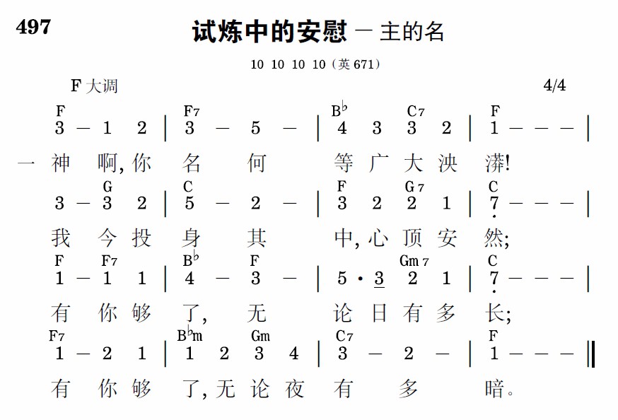 我的神啊,你在已过路上,曾用爱的神迹多方眷顾;故我敢再投入你的胸膛,因信心安,赞美你的道路。