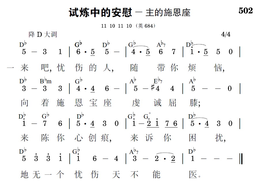 来罢,忧伤的人,随带你烦恼,向着施恩宝座虔诚屈膝;来陈你心创痕,来诉你困扰,地无一个忧伤天不能医。